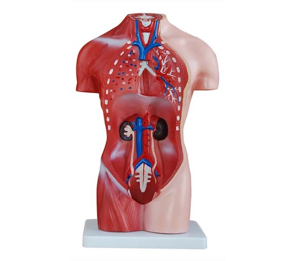 This male torso features 13 parts, including torso, head (2 parts), brain, lung (2 parts), heart (2 parts), stomach, liver, kidney, pancreas and spleen and intestine. Made of PVC plastic. Mounted on plastic base.