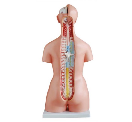 This outstanding torso features an exposed spine with removable vertebra and spinal cord segments, a female breast plate and interchangeable male and female genitalia. The female organs include a fetus in the womb. Dissected into 23 parts: torso, female breast plate, head, eyeball, brain, vertebra spinal nerves, lung (2 parts), heart (2 parts), liver, kidney, stomach (2 parts), intestines (4 parts), male genitalia (2 parts) and female genitalia with fetus (3 parts). Made of PVC plastic. Mounted on a plastic base.
