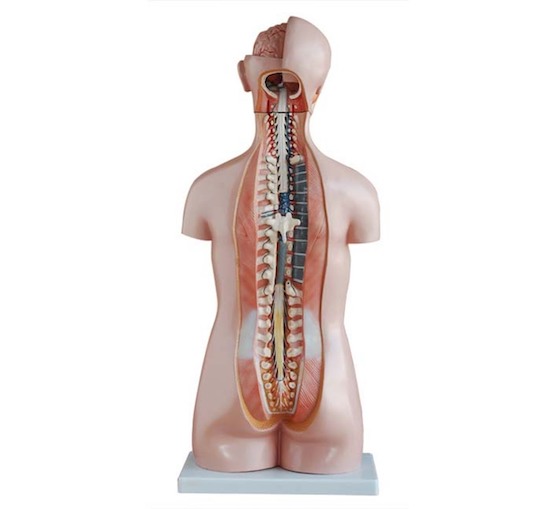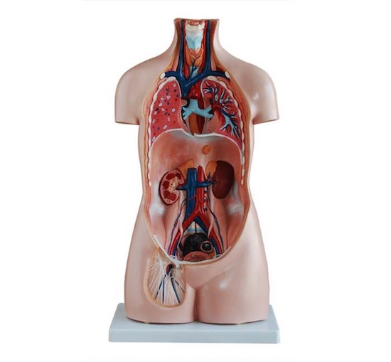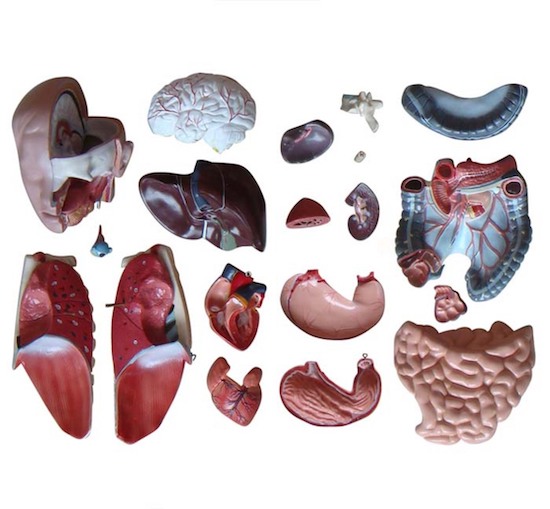 This sexless model including 20 dissectible parts: torso, head, eye, brain, lung with sternum and rib attachments (2 parts), heart (2 parts), stomach (2 parts), liver, spleen, kidney, intestine (4 parts), urinary bladder and vertebra spinal nerves (2 parts). Open back. Mounted on plastic base.
