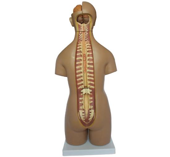 This unisex torso including 20 parts: torso, head, eyeball, brain, lung (2 parts), heart (2 parts), liver, gallbladder, kidney, stomach (2 parts), intestines (2 parts), male genitalia (2 parts), female genitalia (2 parts) and vertebra spinal nerves.