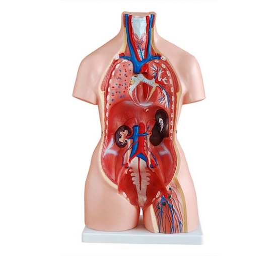 This outstanding torso features an exposed spine with removable vertebra and spinal cord segments, a female breast plate and interchangeable male and female genitalia. The female organs include a fetus in the womb. Dissected into 23 parts: torso, female breast plate, head, eyeball, brain, vertebra spinal nerves, lung (2 parts), heart (2 parts), liver, kidney, stomach (2 parts), intestines (4 parts), male genitalia (2 parts) and female genitalia with fetus (3 parts). Made of PVC plastic. Mounted on a plastic base.